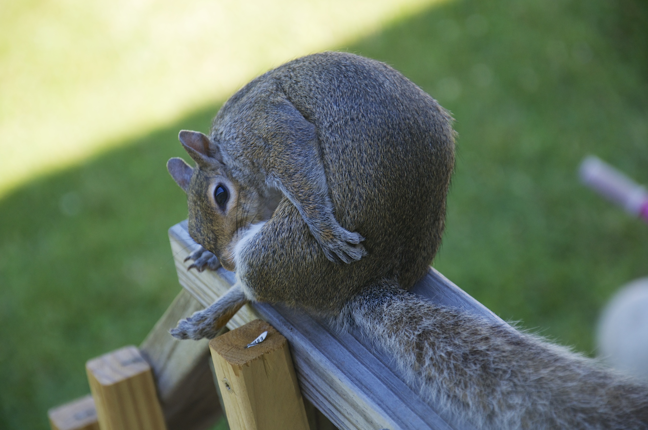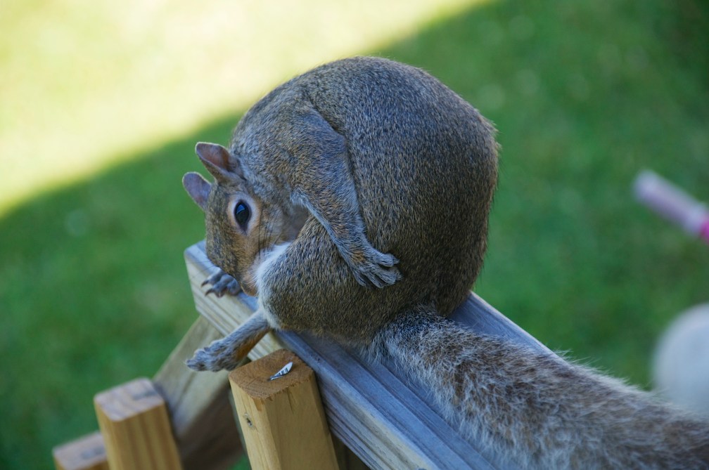 We have a lot of squirrels where we live; I caught this guy tending to himself on the back staircase. He got embarrassed after a while and ran off.