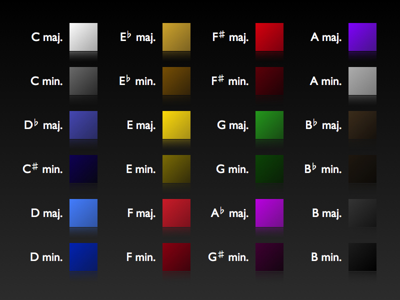 My personal key-color relationships. Even ignoring the colors, notice that the minor keys are universally darker than the major ones.