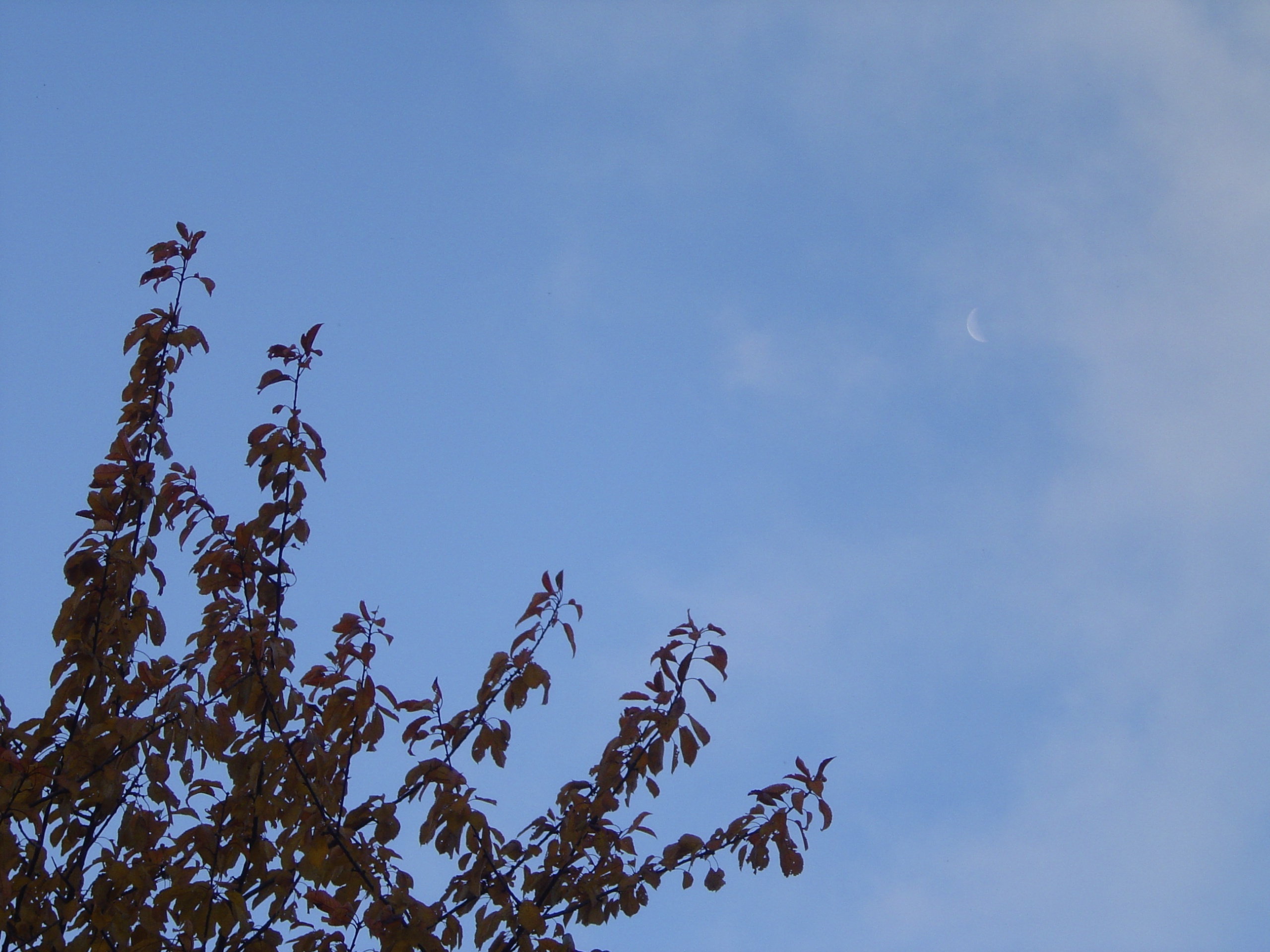 Daily Photo: November 3, 2007 See the moon? The late autumn sky from our backyard. This time of the year is my favorite; the seasons are wrapping up, all life is coming to a close, and the darkness is settling in. share this! Click to email a link to a friend (Opens in new window) Email Click to share on X (Opens in new window) X Click to share on Facebook (Opens in new window) Facebook Click to share on Pinterest (Opens in new window) Pinterest Click to share on Tumblr (Opens in new window) Tumblr Like Loading... Related