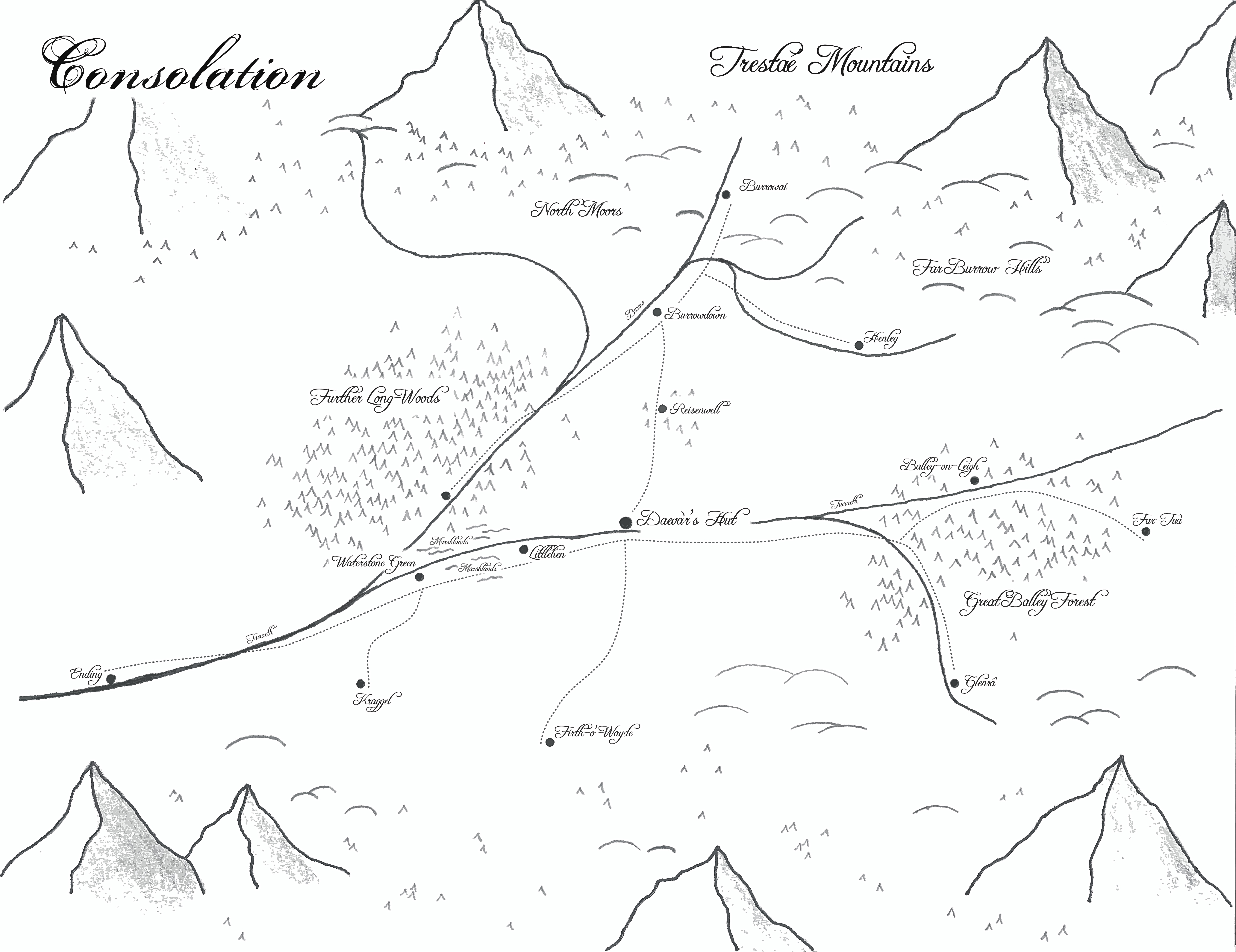 I’ve completely neglected to review my edits for The Redemption of Erâth: Consolation for the past few days, but it’s okay because I’ve been working on updating two of my maps of Erâth. It’s been a long process and I’m a little nervous because I’m no artist, but I felt that I needed something with a more…handcrafted feel to it. I actually printed out (in black and white) the computer-created maps, and then traced landmarks – rivers, mountains, cities – first in pencil, and then again in ink. I rescanned these into my iMac and brushed them up a little in Photoshop (I’m terrible at keeping the paper clean). They’re intended to look a little two-tone-ish, but I’m not sure how it came off.